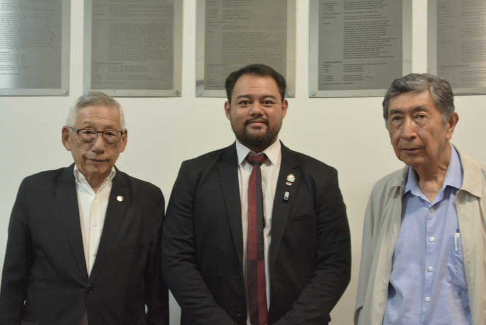 Na foto: o vereador de Peruíbe, Fernando Uraguti, entre o presidente do Bunkyo, Roberto Nishio e Tomio Katsuragawa.