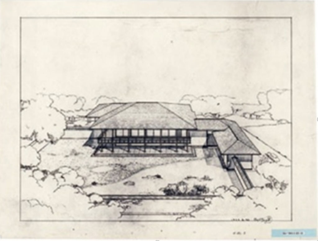 HORIGUCHI Sutemi | Desenho em perspectiva do exterior – projeto proposto para o Pavilhão Japonês