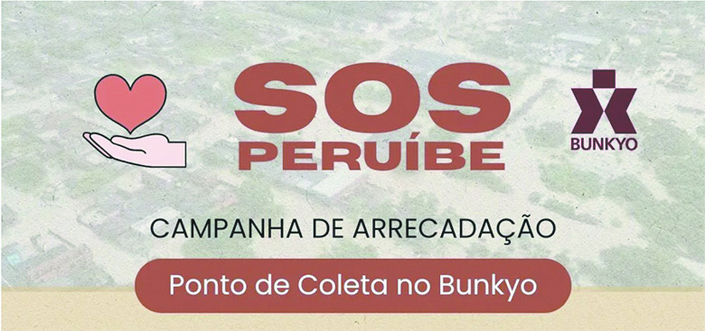 CAMPANHA DE ARRECADAÇÃO SOS PERUÍBE Ponto de coleta no Bunkyo: Rua São Joaquim, 381, Liberdade – São Paulo (próx. à estação São Joaquim) Horário: de segunda a sexta-feira, das 9h às 17h30 Informações: 11 93250-1202 | contato@bunkyo.org.br