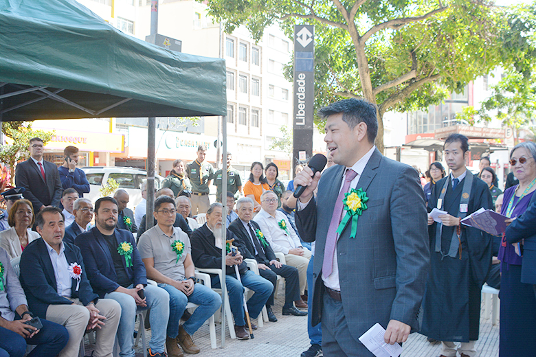 Homenagem – Em sua saudação, o embaixador manifestou sua alegria em estar na Praça da Liberdade-África-Japão e agradeceu aos organizadores, autoridades e à comunidade nipo-brasileira, destacando o amor do povo brasileiro pela cultura japonesa.
